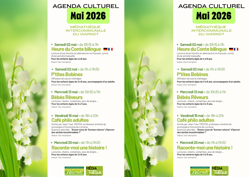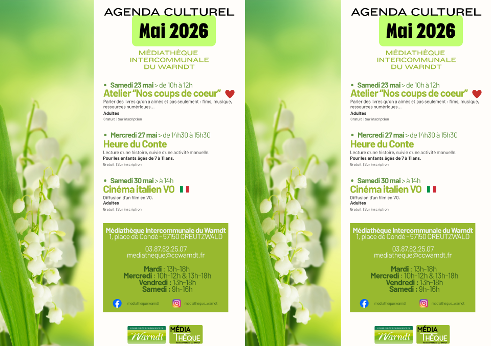 Découvrez l’agenda culturel de la Médiathèque Intercommunale du Warndt pour le mois de Mai 2026 en cliquant sur ce lien : https://www.mediatheque-du-warndt.net/cms/articleview/id/540