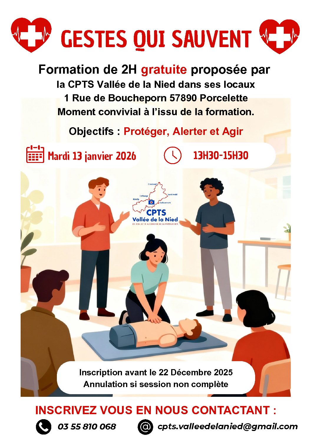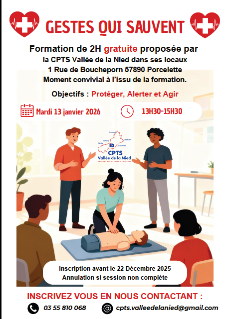 Cette formation se déroulera le mardi 13 janvier 2026, de 13h30 à 15h30 à la CPTS de Porcelette (1 Rue de Boucheporn, 57890 Porcelette).